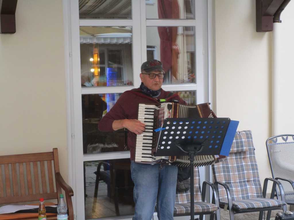 Winfried Biber folgte der Einladung in die Stiftung zu einem musikalischen Nachmittag. Da er kein Unbekannter mehr ist, freuten sich die Bewohner sehr auf das Spiel mit dem Akkordeon. Sommerliche Temperaturen optimierten den Besuch im Garten. In lockerer Folge begeisterte Winfried Biber mit Schlagern aus früheren Zeiten. Wer wollte sang einfach mit. Trotz der bestehenden Auflagen wie Hygieneregeln, Abstand und Schutzmaske war die Veranstaltung ein voller Erfolg.