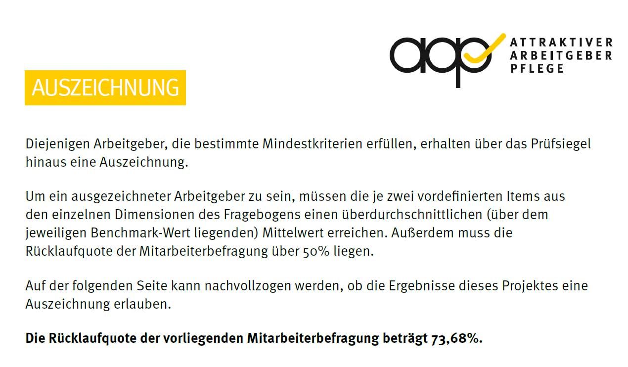 Um ein die Auszeichnung zu erhalten, müssen bestimmte Kriterien überdurchschnittlich erfüllt sein. Die Prüfung ist anonym, valide und wissenschaftlich getestet. Des Weiteren muss die Beteiligung der Mitarbeiter über 50 Prozent betragen.